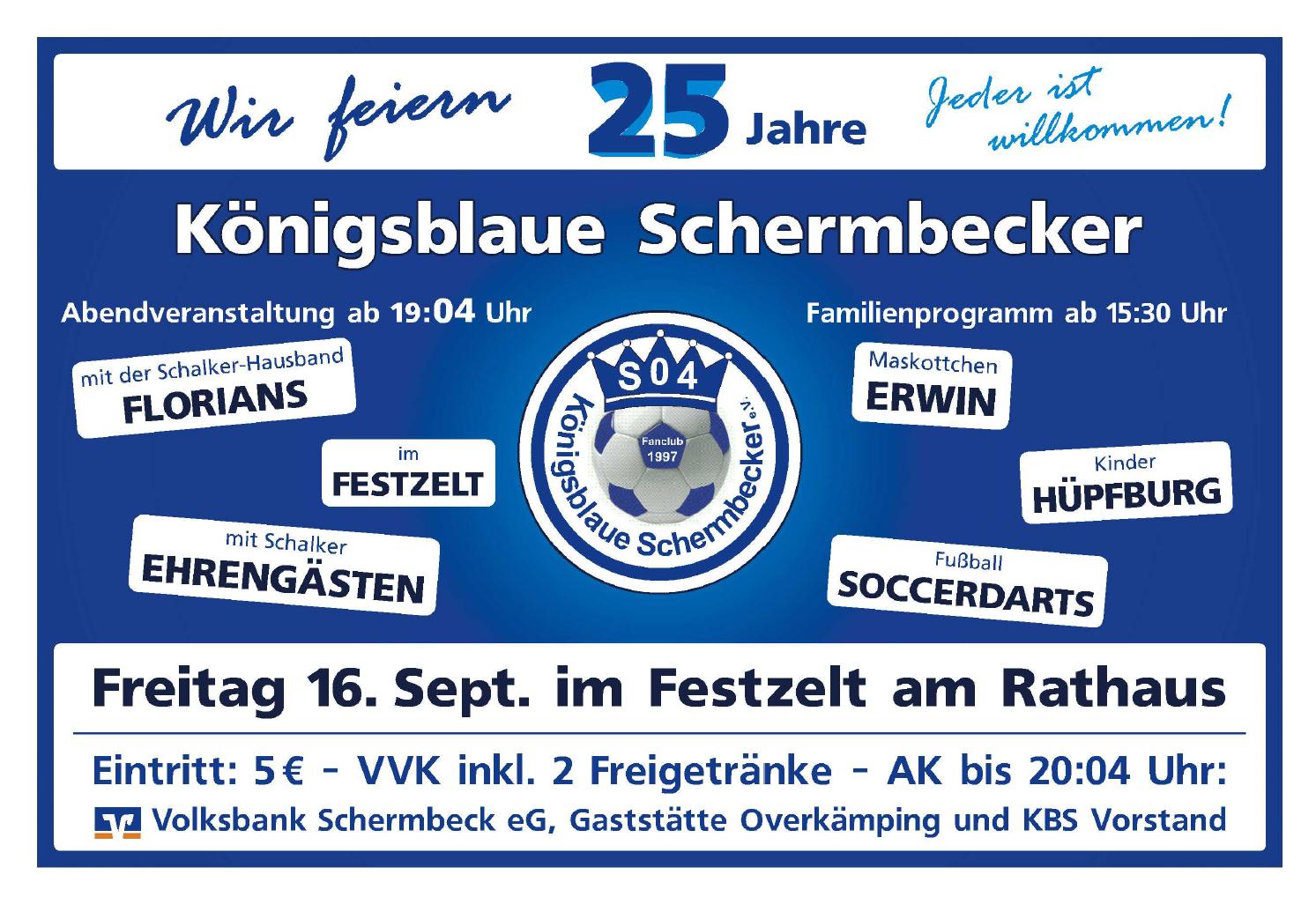 Den 16. Sept. 2022 sollte man sich auf jeden Fall vormerken. An diesem Freitag feiert der Fanclub sein 25-jähriges Bestehen im Festzelt am Rathausplatz. Am Nachmittag steht für unseren „Fanclub-Nachwuchs“ Spaß und Spiel auf dem Programm. Am Abend werden die Florians, die Hausband von Schalke, zu Gast sein.