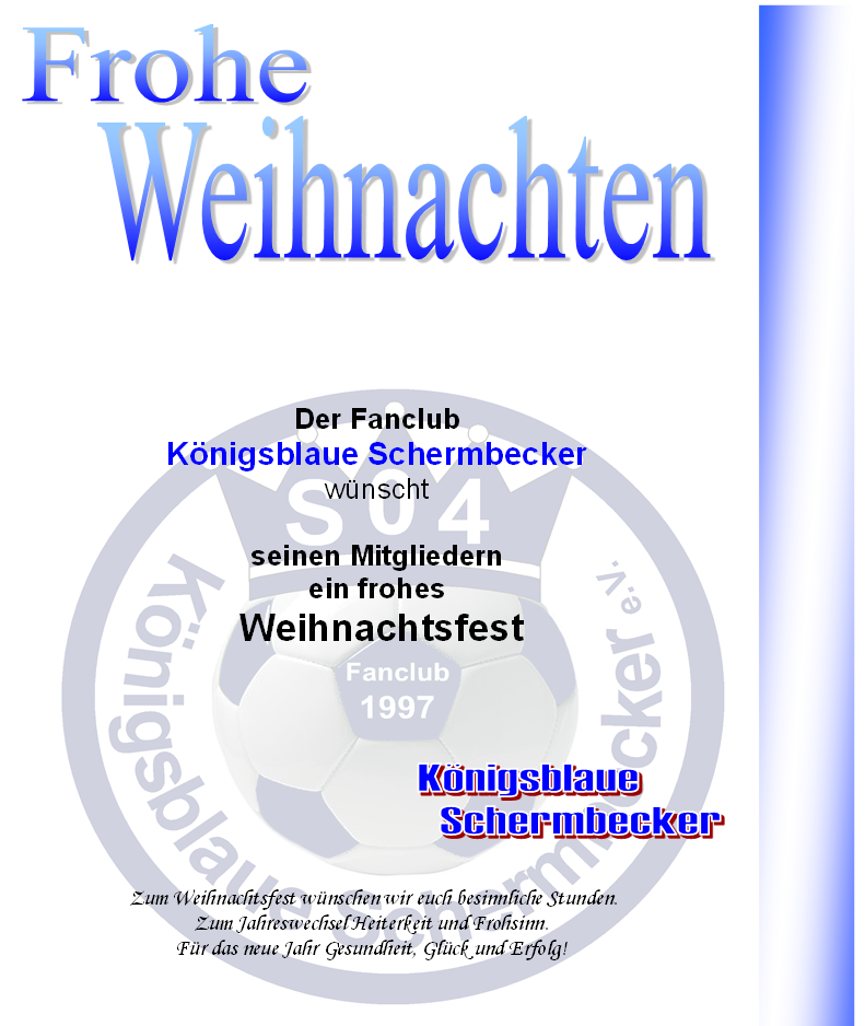 Wie bereits im Infobrief vom 07.11.2023 mitgeteilt, laden wir alle Mitglieder zur 28. Jahreshauptversammlung unseres Fanclubs „Königsblaue Schermbecker e. V.“ am Freitag, den 19.01.2024 um 20:04 Uhr in die Gaststätte Overkämping - Schult ein.